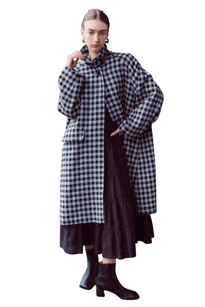 首元までおおうハリのある1枚で可憐なチェックを行儀よく。洗練されたモノトーン&行儀よく並ぶブロックでチェック柄ながらほっこり感はなし。コートのAラインに合わせて、中に着たワンピースもフレアでそろえ、なじませればパーフェクト。