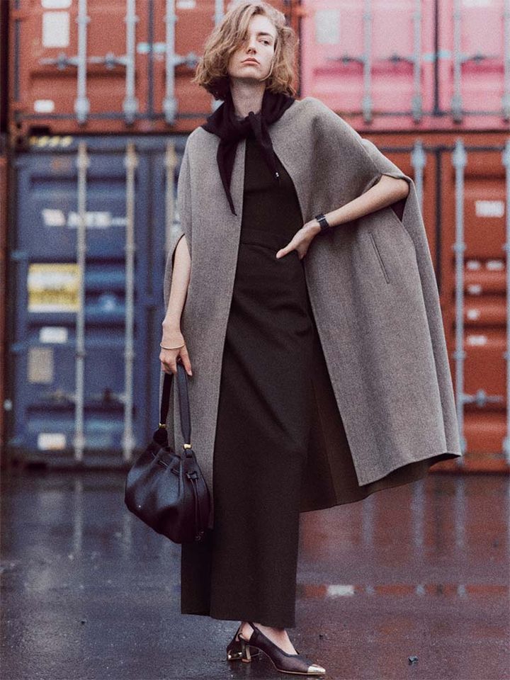 ジレほどモードに傾かず寒々しくも見えない、ひじくらいまでおおえる丸みを帯びたケープデザイン。もはやトップスの一部として活用でき、コートを羽織るだけだったウィンタースタイルも容易く一変。主張しすぎないから意外にもテイストを選ばず着られ、Iラインのシルエットによりスタイルアップも簡単に。