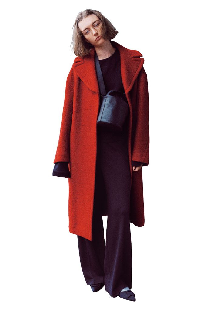 鮮烈でありながら、ツイード特有の温かみのある起毛感でどこか親しみやすさも。レトロなビッグカラーが、ミニマルなダークトーンの上下に「着飾る楽しさ」を思い出させる。気負わず、ただバサッと羽織る。それだけで絵になる、主役級の存在感。
