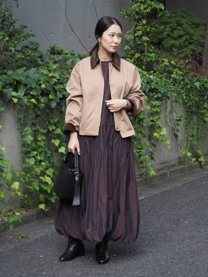 適度に光沢のある「ティアラ」のバルーンワンピースは、スカートのボリューム感と歩くたびにふんわり揺れる動きのあるデザインが魅力。デザインや素材に甘さを感じるアイテムも、カラー選びで印象がガラリ。「ブラウンだと大人にもなじむと思います」。ドラマティックな主役級アイテムに、あえてラフなブルゾンを合わせた絶妙なバランスがステキ。