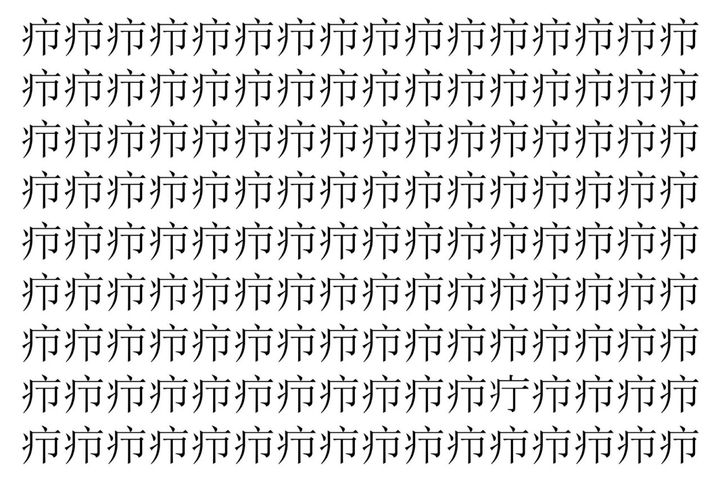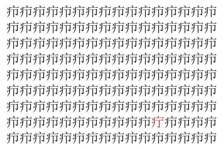 画像の中には、「疖」という漢字が縦に9行、横に16個並んでいます。 全部で144個となりますが・・・、そのうち1つは「異なる漢字」となってますよ!!