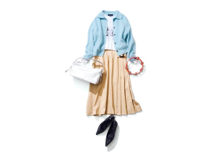 プリントTシャツ¥18,700/スリードッツ(スリードッツ表参道店) 襟付きニット¥39,600/アンタイトル サイドプリーツスカート¥24,200/アルページュストーリー シルバーバッグ¥15,400/Stola. ツイードパンプス¥6,590/ZARA(ザラ)