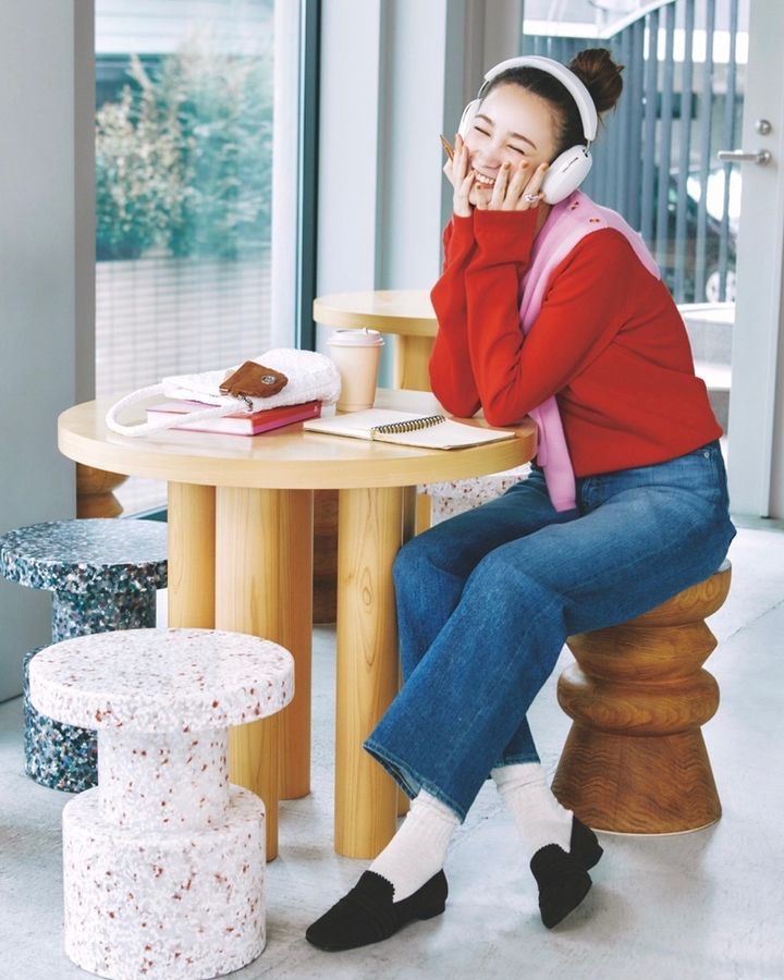 ドッキングニット¥62,667(インク/サロン アダム エ ロペ〈ジュンカスタマーセンター〉)デニムパンツ¥37,400(ヤヌーク/カイタックインターナショナル)机に置いたバッグ¥8,150(mucu and ebony/HANA KOREA)バッグに付けたチャーム各¥5,610(ともにminitmute/HANA SHOWROOM)靴¥64,900(ネブローニ)靴下¥1,210(靴下屋/タビオ)リング¥37,400(Completedworks/ピモンテ)