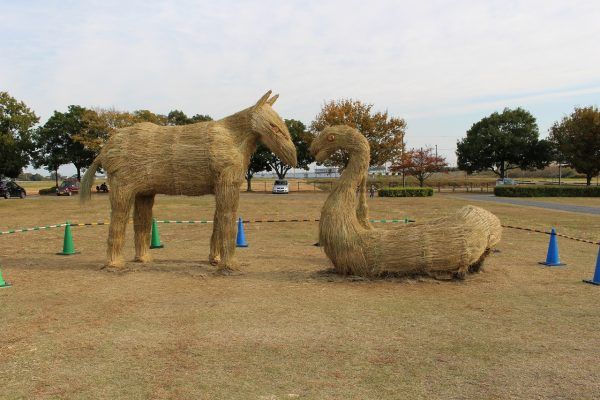 田んぼアートの稲わらを使用し、新旧干支の「へび」「うま」をモチーフにした「わらアート」も!