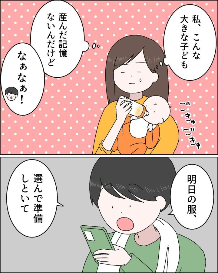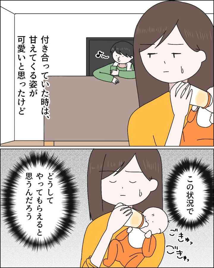 2児の母になった私ですが、もう一人、産んだ記憶の無い大きな子どもがいるようです。そんなことを考えながらミルクをあげていると、今度は明日着る服を選んで準備してほしいとマサオが言ってきました。振り返ると、まだ濡れた髪のままテレビの前に座り、スマホを眺めていました。