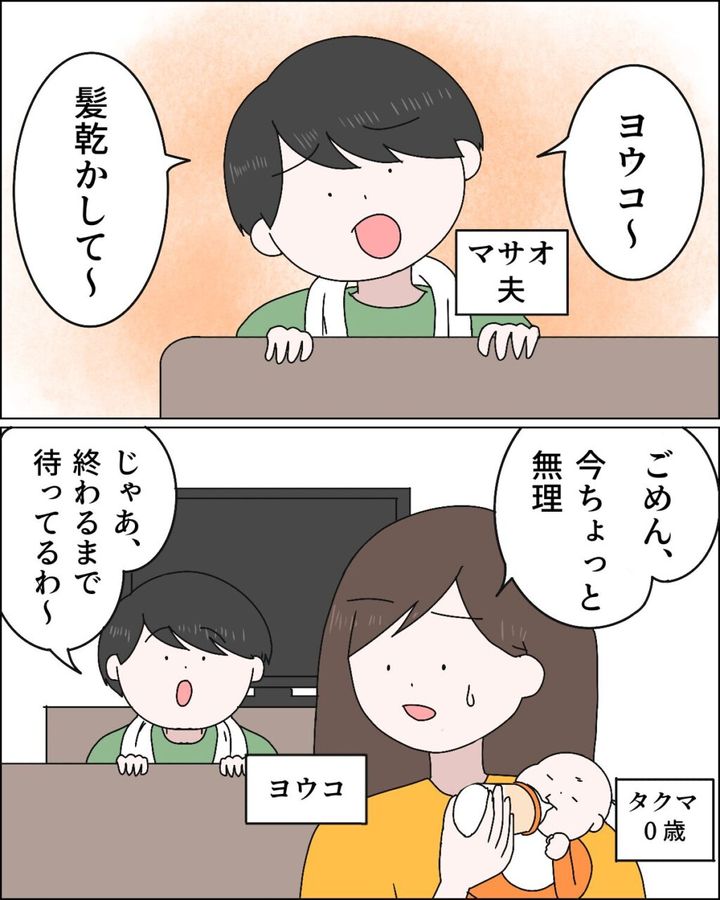 産まれたばかりのタクマにミルクをあげつつ、次は3歳のソウマの歯磨き、それから寝かしつけて洗濯して・・・と私の頭の中は2人のお世話のことでいっぱいでした。そんなときにお風呂から出てきた夫マサオが「ヨウコ~、髪乾かして~」と言ってきました。はぁ?目の前で自分の息子にミルクあげてる私が見えないのかな?今ちょっと無理だと伝えると、マサオはのんきに「じゃあ、終わるまで待ってるわ~」とテレビの前に座って言いました。