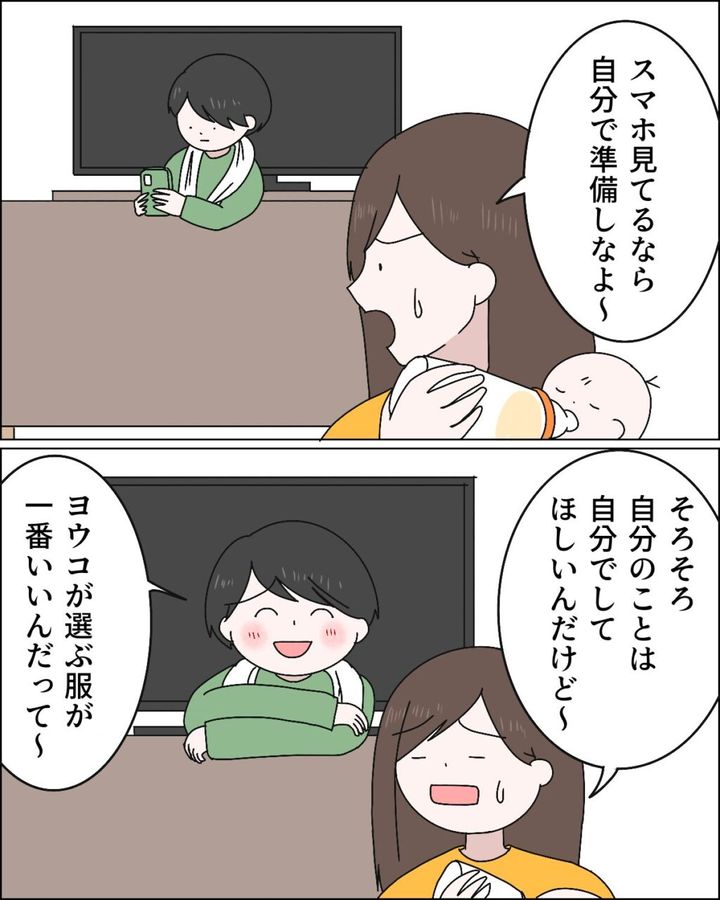 「スマホ見てるなら自分で準備しなよ~」と、至極当然のことを言ったつもりでしたがマサオはまるで動じない様子で「ヨウコが選ぶ服が一番いい」と悪びれる様子がありません。そろそろ自分のことは自分でしてほしいと本気で訴えました。
