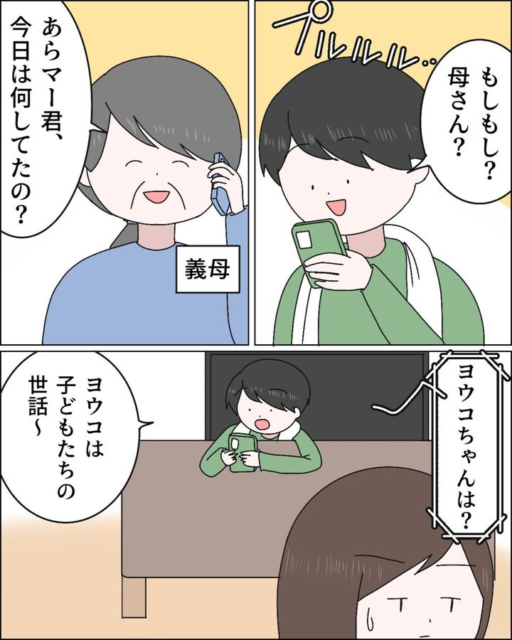 マサオは私の心からの訴えを気にする様子もなく、お決まりの行動を始めました。日課である、義母への電話。しかも必ずスピーカーでかけるのです。義母は嬉しそうな声で「マー君、今日は何してたの?ヨウコちゃんは?」と電話に出てきました。「ヨウコは子どもたちの世話~」と何もしないマサオの回答。スピーカー機能で話しているので丸聞こえです。