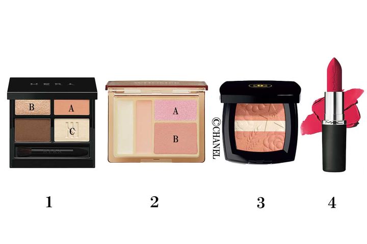 2 4種の異なるチーク&ベースを塗り分ければ立体感も抜け感もいただき♥ イエローベースのピンクで多幸感UP。
