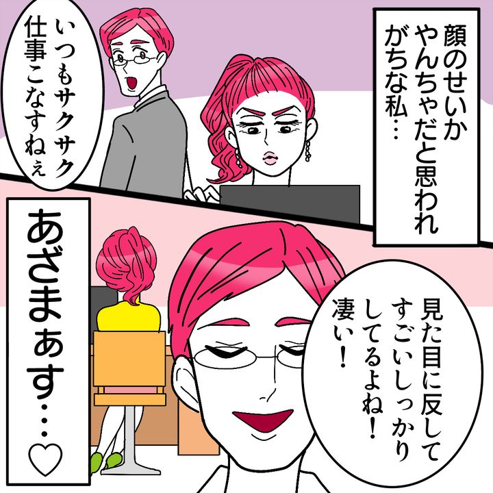 人の見た目に言及するのは本来よくないことかもしれませんが、投稿者さんと職場の男性には信頼関係があるので問題ないようです。投稿者さんの「あざまぁす(はあと)」といった心の声に、嬉しさがにじみ出ていますね。でも次からは「見た目に反して」は言わなくて大丈夫です!