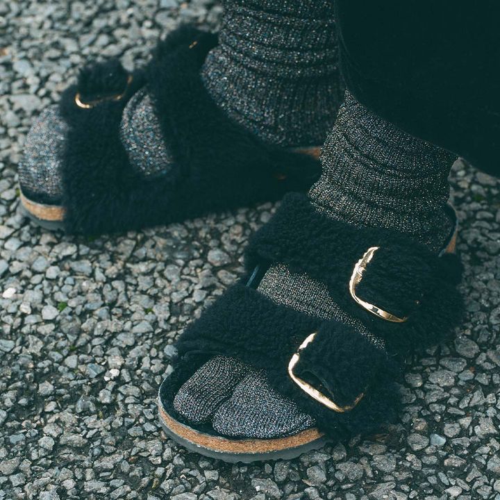 『ビルケンシュトック』のサンダルはボア素材で冬モードをオン! ラメソックスを合わせた、冬でも足元から遊び心を忘れない。