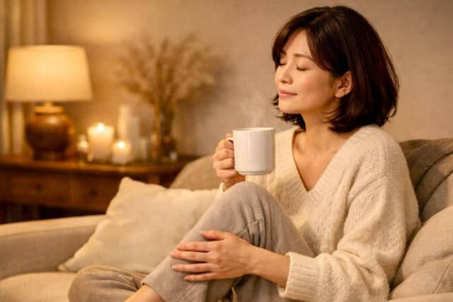 そこで前日の夜に意識したいのが、体を“温めてゆるめる”こと。湯船にゆっくり浸かると、冷えて縮こまっていた筋肉がほぐれ、巡りが自然と整い始めます。さらに、部屋の照明を落として温かい飲み物を飲むだけでも、呼吸が深まり、自律神経が切り替わりやすい状態に。緊張がほどけることで、翌朝のむくみ方が確実に変わってきます。