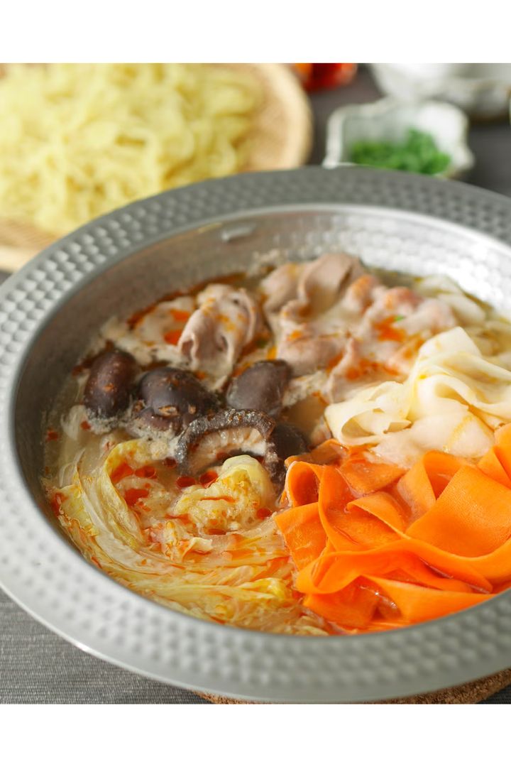 しいたけや豚バラ肉のうま味が染み出たスープに、ラー油を効かせた酸っぱ辛い鍋は、寒い日にぴったりな身体が芯からあたたまる味わい。〆には中華麺を入れて水溶き片栗粉でとろみをつけたら、サンラータン麵風に楽しもう。