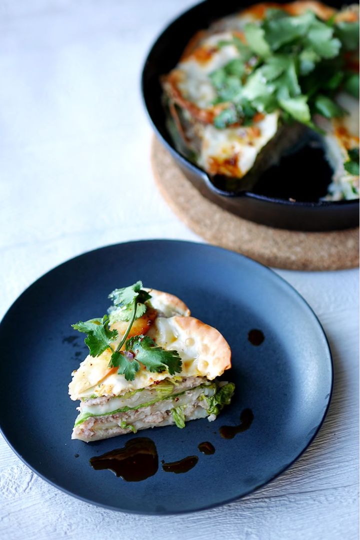 材料3つで作れる簡単ミルフィーユ餃子。刻んだ白菜の葉と挽き肉を合わせた肉だねを、餃子の皮と交互に重ね合わせて、オーブンで焼くだけ。パリッとした餃子の皮とジューシーな具材のコントラストがクセになる。手軽に作れて食べ応えも抜群なのでぜひ試して。