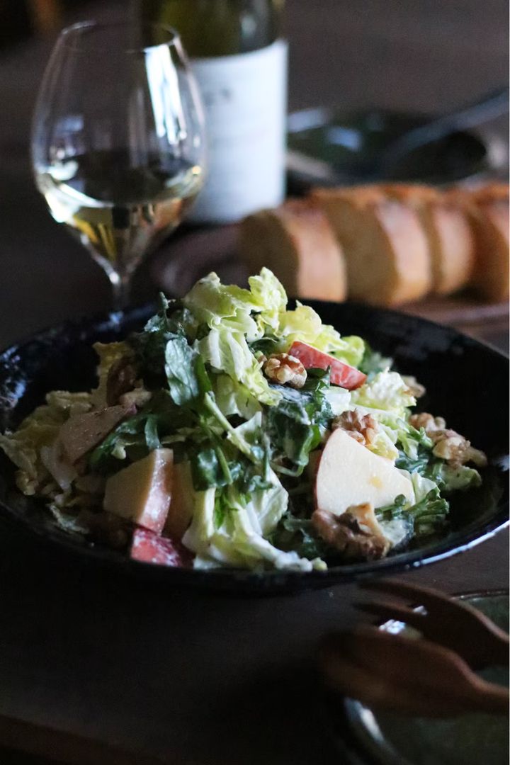 りんごのすっきりとした甘みがアクセントのごちそうサラダ。パルミジャーノ・レッジャーノを加えたコク深いドレッシングがりんごに絡み、甘じょっぱい味わいに。葉物野菜にはシャキッと歯応えのある白菜と風味豊かなクレソンを使って冬らしくおしゃれな味わいに仕上げよう。