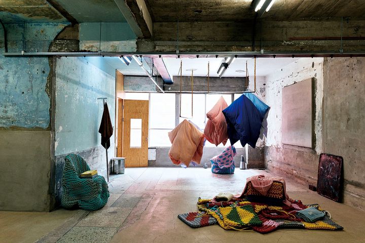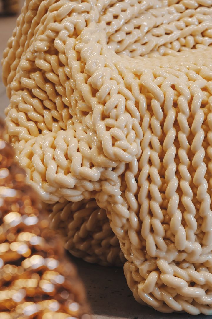 さまざまな素材を編み上げる作品で知られるカンホだが、今回初めて採用したのが、スポンジパイプという素材だ。韓国では建築の断熱材として使われるほか、子どもたちのおもちゃにも用いられる身近な存在だという。一方で、その質感は非常に柔らかく、同時にきわめて脆いという特性も併せ持っている。