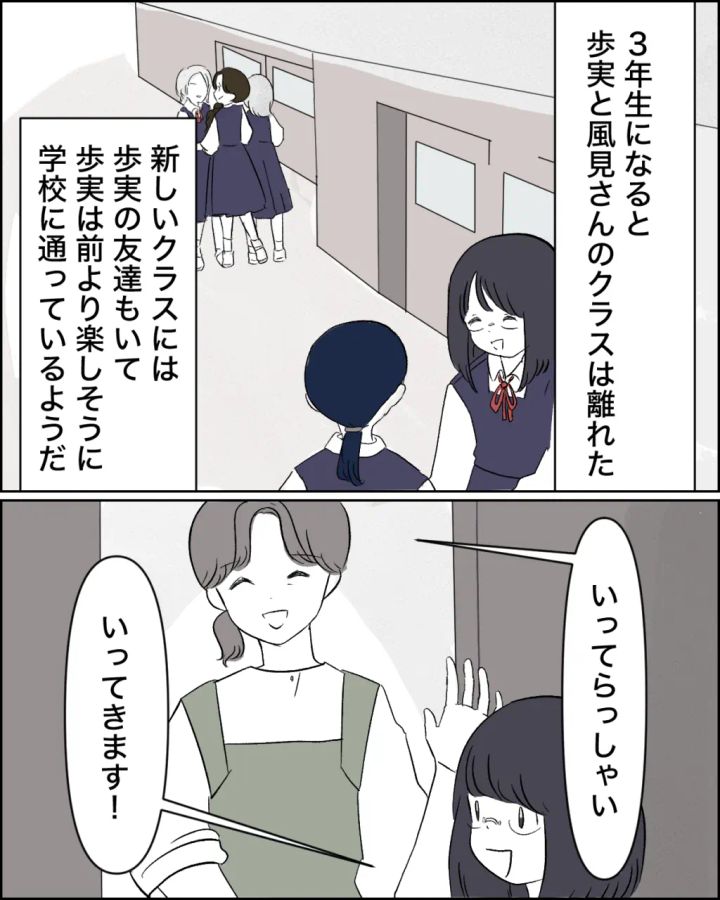 あれからしばらくして、歩実は3年生になりました。風見さんとはクラスが離れ、新しいクラスには仲の良い友達もいて、以前よりも楽しそうに学校に通っています。「いってきます!」と明るく家を出る歩実を「いってらっしゃい」と安心して送り出せるようになりました。