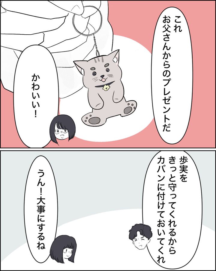 後日、博之が「これ、お父さんからのプレゼントだ」と歩実に渡したのは、クッキーにそっくりな猫のぬいぐるみのキーホルダー。「歩実をきっと守ってくれるからカバンに付けておいてくれ」と言うと、「うん!大事にするね」と歩実はとても喜んでいました。