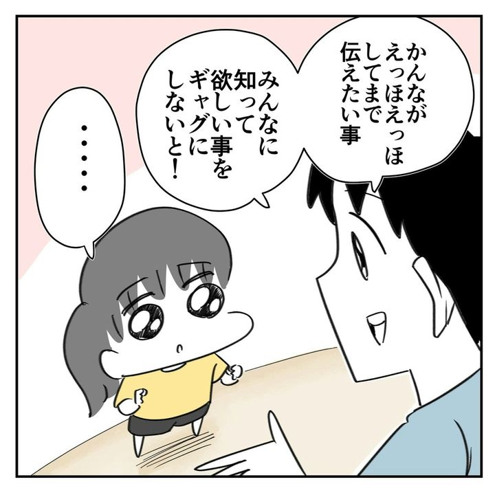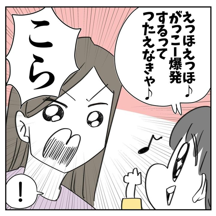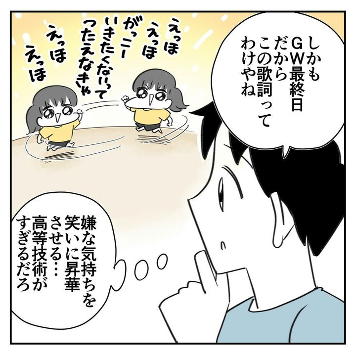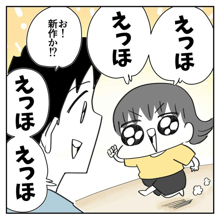 ママが怒るとわかっていながら、渾身のギャグを披露した娘、なかなかやりますね。子どもから見たママの姿とはいえ、ママの気持ちは複雑です…。そんな娘が「えっほえっほ」で伝えたいこと、まだまだあるのかも。できればママが笑顔になることだといいんですけどね。