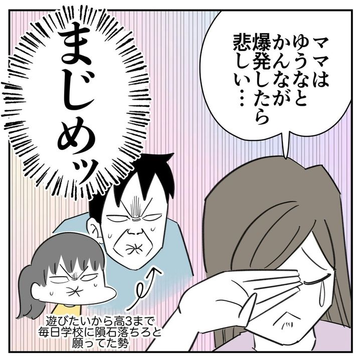 こばぱぱ(@kobapapaaa)さんの娘は、連休明けで学校へ行くのが嫌なことを、流行りの「えっほえっほ」で伝えてきました。さらにエスカレートして「学校が爆発する」といい出したので、違うことを伝えるようにと諭しました。すると、ママのあることを言い始めて…。