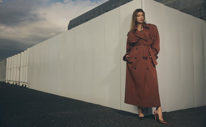 山田さんもプライベートで愛用しているというトレンチコートがブラッシュアップされて登場。ハリがありつつしなやかなコットンシルク素材を使用し、長めの丈感、さり気なく肩パッドの入ったオーバーサイズなフォルムで、クラシックなアイテムをモダンに解釈。「ウエストを絞って、コートドレスとしても楽しめるアイコニックなピース。モカブラウンが洒落てますよね。ピンヒールがこれだけ似合うコートは他にないと思います」と長澤さんも絶賛。
