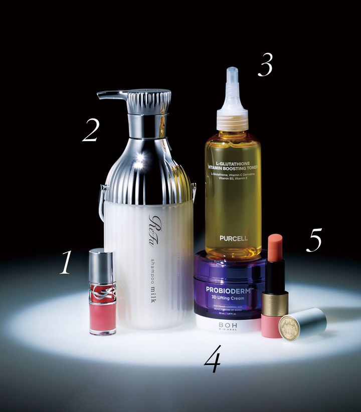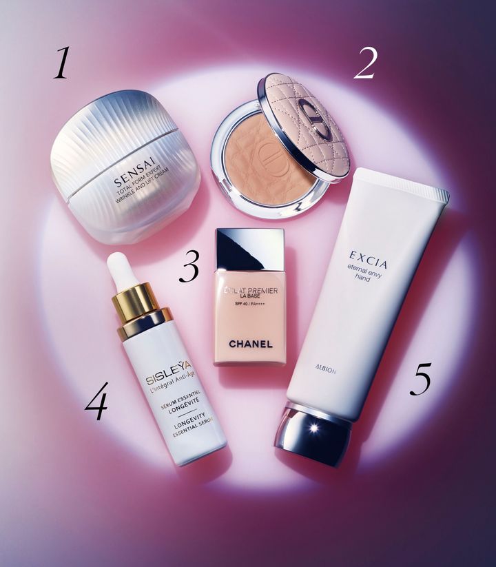 今年のアイテムは「このレベルをスキンケアでかなえてくれるの⁉」と、製品力の高さに感動したという石井美保さん。「今年はスキンケア効果に敏感でない人でも“実感できる”製品が増えたように感じます。例えば、『センサイ』のトータルフォルムエキスパート リンクルリフトクリーム(1)。オペでしかできない顔の肉の再配置がかなうかも……と期待してしまうほど。頬はふっくら、下垂して肥大化した部分はスッキリ。このクリームを塗っている時間がリチュアルのような至福のひとときに。『シスレー』のシスレイヤ インテグラル エッセンシャル セラム(3)は、すでに2本使い切りました。エイジング世代ど真ん中を走る私にとって、肌の“クタクタ感”が払拭され、私的“マスターピース”美容液になりそうです。『エクシア』の“エターナル エンヴィ ハンド”(5)は、他のアイテムと一線を画す“若返りハンドクリーム”。痩せて血管が浮き出てきた手がふっくら整い、自分の手を見るたびうれしくなるほど。メイク製品では、“ディオールスキン フォーエヴァー ヌード マット フィルター”(2)。粉感ゼロで、ブラシでほうれい線をなぞると魔法のように消えてくれます。『シャネル』の“エクラ プルミエ ラバーズ”(3)は、ノイズを一切感じさせず、顔のアラを自然な光で飛ばしてくれ重宝中。年齢による悩みをハイレベルに解消するコスメのおかげで、美容の未来は明るいと実感しています」
