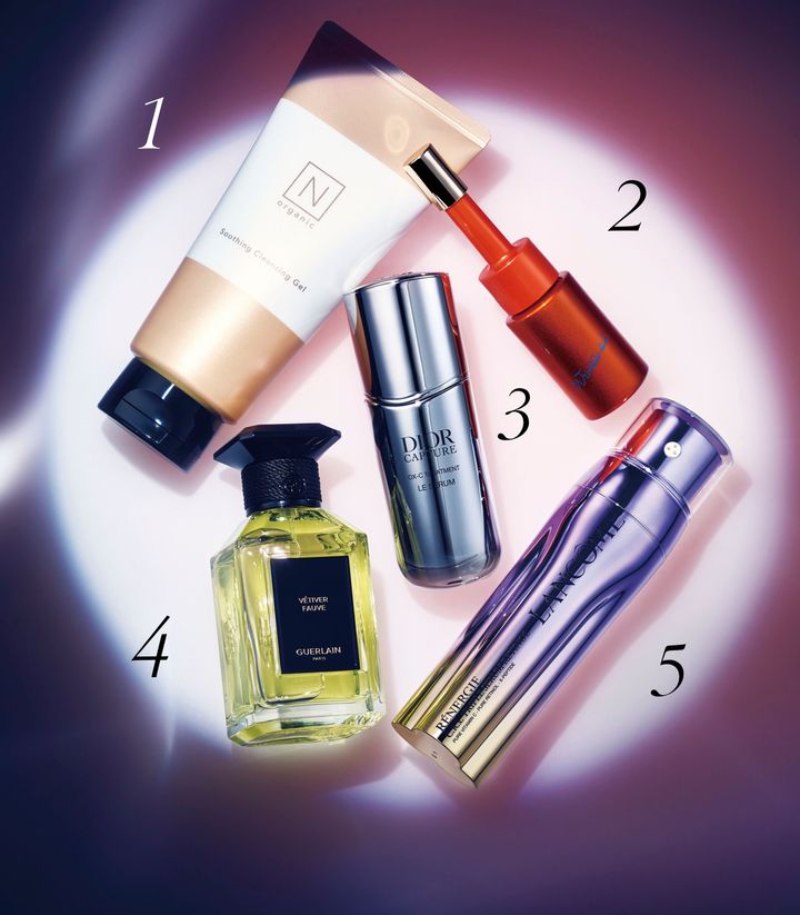 あらゆるスキンケア製品を高い解像度で分析する友利 新さんは、一品で多機能にアプローチするコスメに注目。「ここ数年、スキンケアは一つの肌悩みに対してではなく、マルチに働きかけるアイテムが顕著に増えています。『ディオール』の‘‘カプチュール ル セラム”(3)は、幹細胞のある基底膜にアプローチすることで、結果的に真皮や表皮にまで働きかけ、肌の調子を底上げするアイテム。『ランコム』の‘‘レネルジー CRX トリプル セラム”(5)は、レチノール、ビタミンC、ペプチドというスター成分を一本にまとめ、相乗効果でさまざまな肌悩みに対応できる包括的なケアが可能で、私自身も愛用。個人的な肌悩みを解決してくれたアイテムでいえば、『N オーガニック』の‘‘ベーシック スージング クレンジング ジェル”(1)。花粉対策のクレンジングジェルとして発表されていましたが、私は花粉症ではないものの、使用すると毛穴汚れの落ち具合が良く、バリア機能が弱っていたのかもという気付きもありました。『ポーラ』の‘‘リンクルショット メディカル セラム デュオ”(2)も、部分ではなく全顔に使い、潜在的なシワにアプローチするという着眼点が新しく、顔はもちろん首のシワ予防にも◎。そして、個人的にどうしても手放せなかったのが『ゲラン』の‘‘ベチバー フォーヴ”(4)。爽やかさと深みを併せ持つ唯一無二の香りで、正真正銘のベストコスメです」