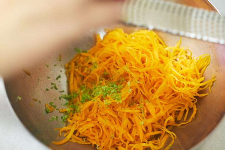 ④人参に、のゴマだれを大さじ1加える。柑橘の皮をゼスターでおろし、搾り汁を加えて完成。