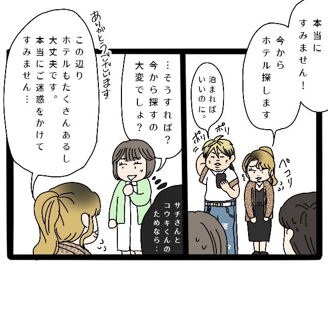 知らなかったとはいえ我が家に迷惑をかけたことを申し訳なく思い「本当にすみません!今からホテル探します」と頭を下げて必死に謝るサチさんの横で、頭をポリポリ搔きながら「泊ればいいのに」と反省ゼロの信也君。私はサチさんとコウキくんが不憫で「・・そうすれば?今から探すの大変でしょ?」と言いましたが、サチさんはそれを断り「この辺りホテルもたくさんあるし大丈夫です。本当にご迷惑をかけてすみません・・」と何度も頭を下げます。