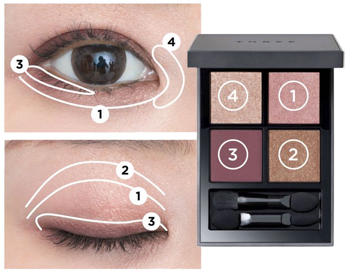 ウォームピンクを軸にしたパレット。立体感を出せる濃淡2色のベージュと締め色のボルドーで吸引力のある目元に。 スターゲージング アイシャドウクアッド 07 ¥7,480(THREE)