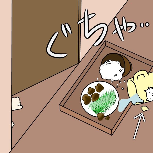 元気な桃ちゃんはママについて行ってお兄さんの食事に激突してしまったよう。