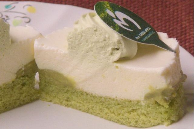 ピスタチオスポンジを土台に、ピスタチオクリームとバニラムースを重ねてあります。