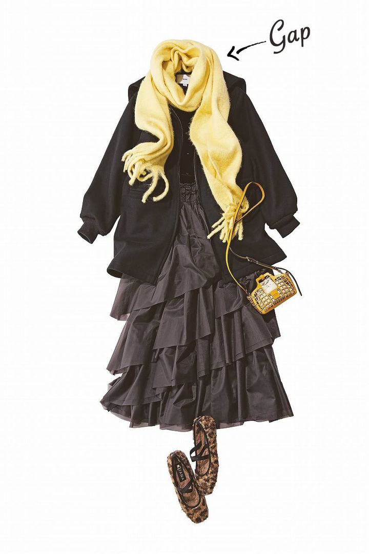 親しみやすいバターイエローのマフラーが、冬の黒コーデにやさしい華やぎをプラス。もこもこ素材で可愛げを添えつつ、モードな黒アウターと合わせれば大人顔に着地。ティアードスカートで甘さを添えれば今どきバランスに。