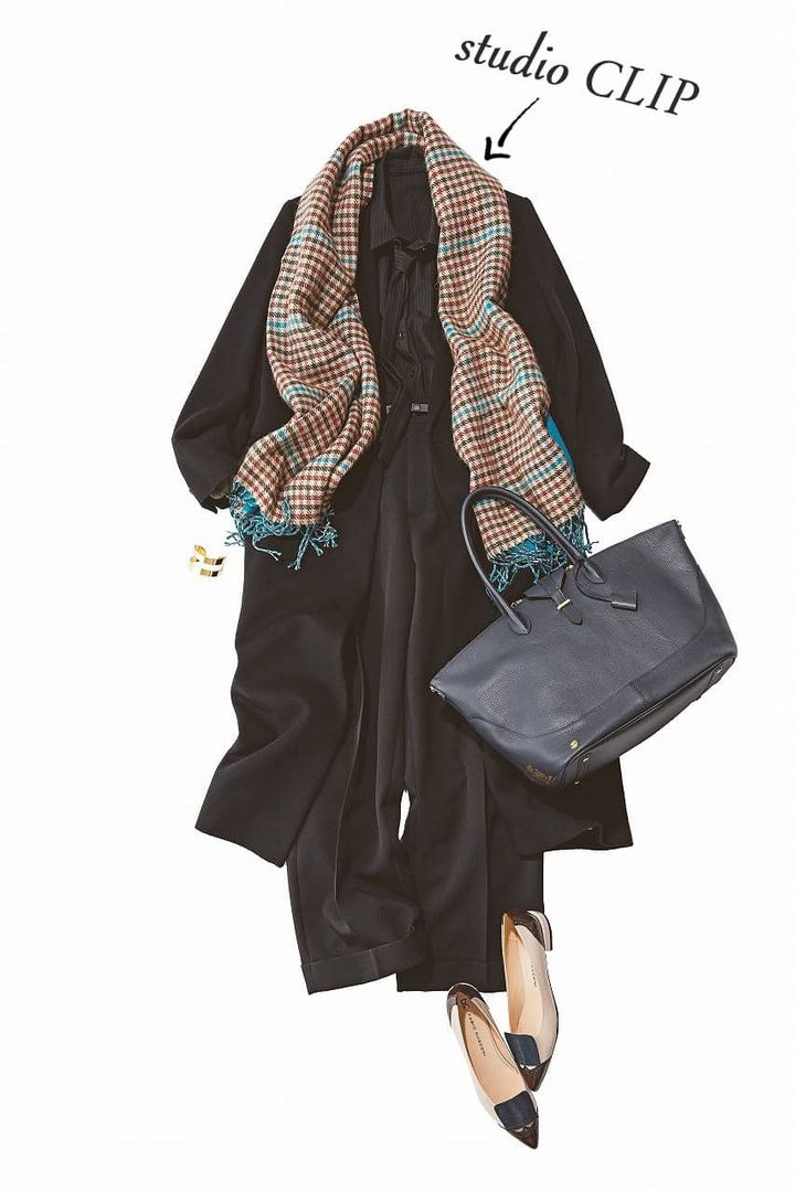 マニッシュな着こなしに、ガンクラブチェックのストールで柔らかなアクセントを。ブルー×ブラウンの配色が、辛口スタイルに程よいカジュアル感を添えてくれます。大人に似合うコスパアイテムが見つかる、スタディオクリップらしい名作!