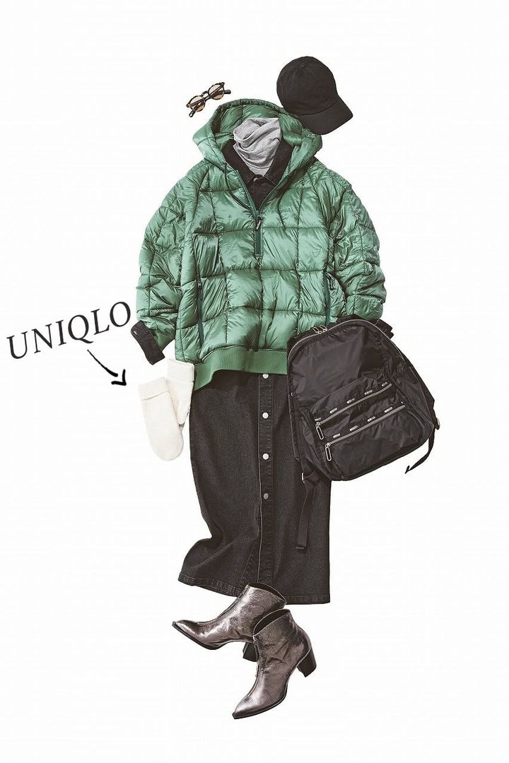 オールブラックにはグリーンアウターで軽やかに更新。デニムワンピのボーイッシュさも、色の力で爽やかに整います。ユニクロのヒートテック手袋なら、暖かさと肌ざわりの良さで信頼感抜群。