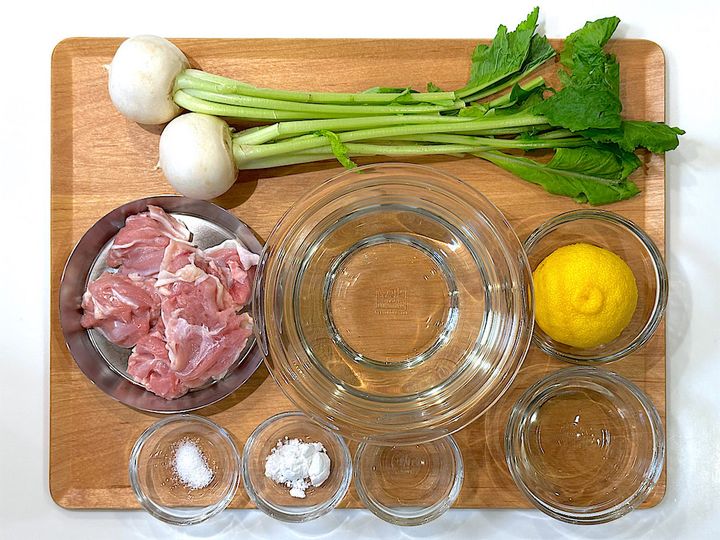 1. かぶは皮を剥いて半分に切り、葉は細かく刻み、鶏もも肉は一口大に切り、ゆずの皮はすり下ろす。