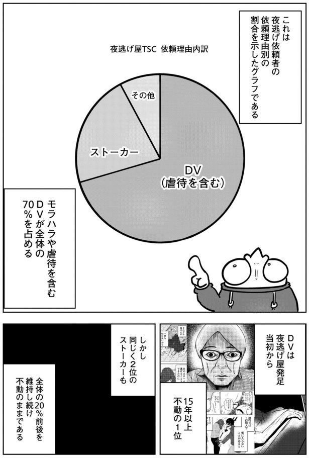 「夜逃げ屋」とは、DVをするパートナーや毒親などから逃げたい人々の引っ越しを手伝う特殊な業者。漫画家を目指していた作者・宮野シンイチはある日、TVで見かけた夜逃げ屋という仕事と、そこを取り仕切る女社長の漫画を描きたいと思い取材を申し込む。取材当日、夜逃げの現場を手伝うことになった宮野は、壮絶な現場を目の当たりにした後、社長の鶴の一声で夜逃げ屋に就職することにーー。外からは普通に見える家庭でも、一歩踏み入れると見えてくる衝撃的な現実。実際に夜逃げ屋で働く作者が、その現場をリアルに描くコミックエッセイ『夜逃げ屋日記』を、ご好評につき再連載いたします。
