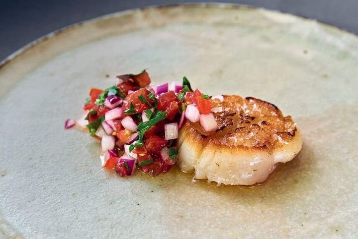 3.1の帆立貝の焼いた面をもう一度、表面がカリカリになるまで20秒焼く。2のサルサメヒカーナをのせ、オリーブオイルをかけて仕上げる。