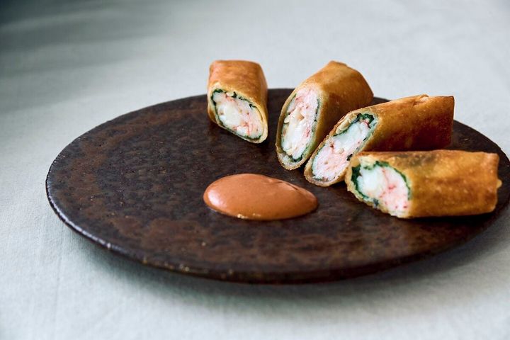 4|海老のたたきの春巻き、オーロラソース