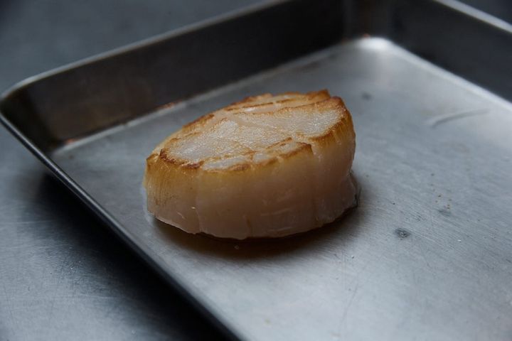 片面を焼いて休ませるというプロセスで、帆立貝のフレッシュさが伝わる焼き上がりに。また、このソースは他の焼いた魚介類にも合います。