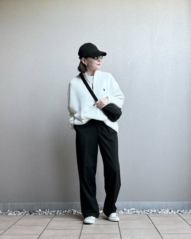 スナップで着用しているハーフジップニットは>>WEGO(ウィゴー)「U.S. POLO ASSN別注畔編みハーフZIPニット」
