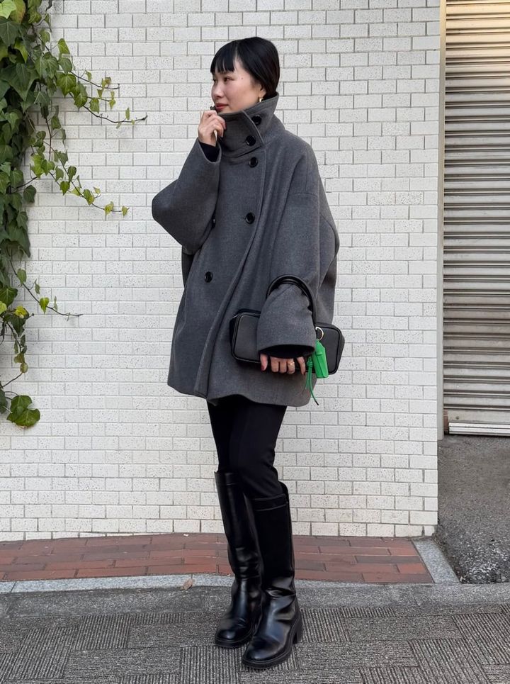 「オーバーサイズのスタンドカラーコートを主役に、他はミニマルにまとめました。細身のパンツにブーツインすることで今年らしいスタイリングに。モノトーンカラーのアクセントに、ノーブルオリジナルのリップホルダーで遊び心をプラスしたのもポイントです」