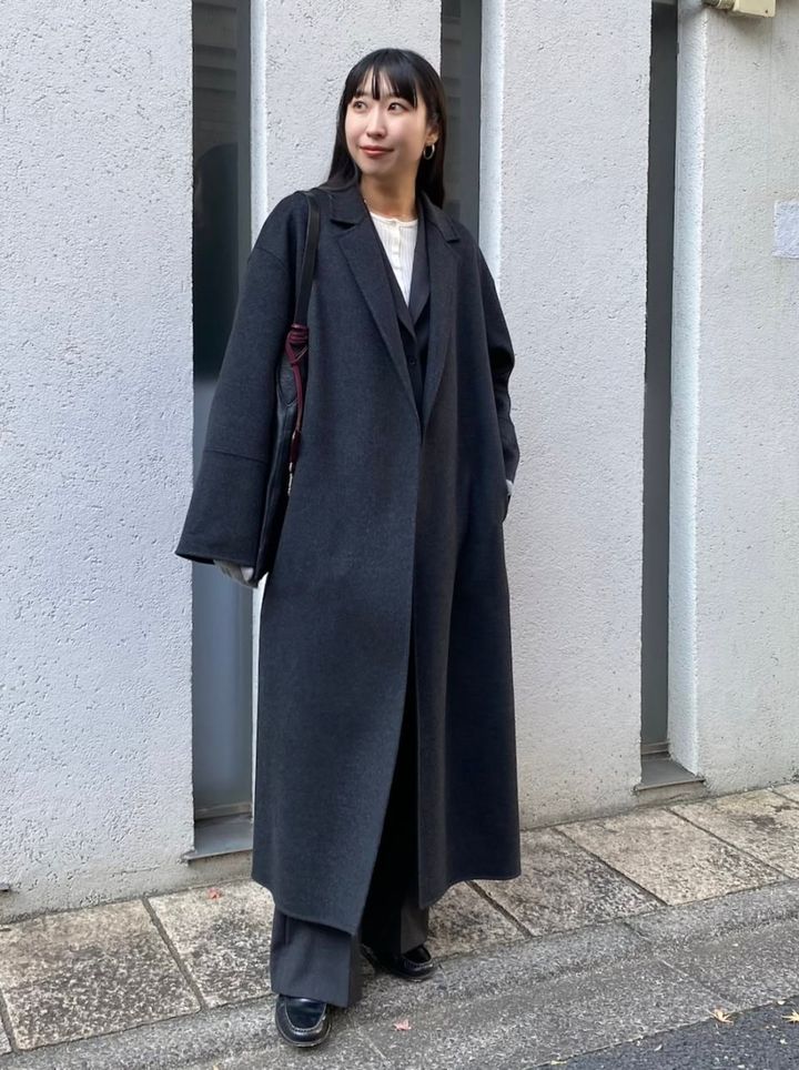 「ブラックのロングコートをメインに、小物などを生かして暗くなり過ぎないようコーディネートしました。またキレイめな形のチェスターコートなので、カジュアルなアイテムを合わせてバランスを意識しています」