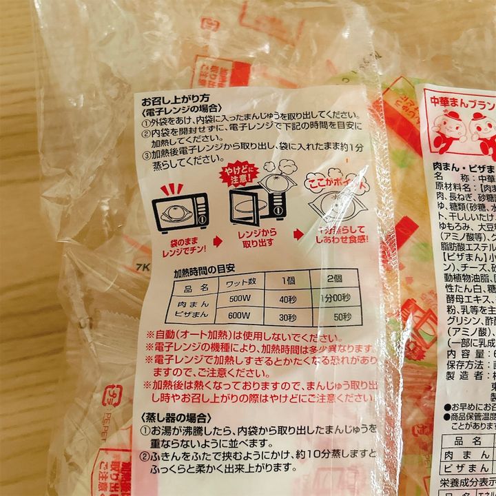 袋の裏に温め方が書いてありますよ。1個の場合は500Wで40秒。600Wだと30秒。そのあと1分、個包装のまま蒸らします。