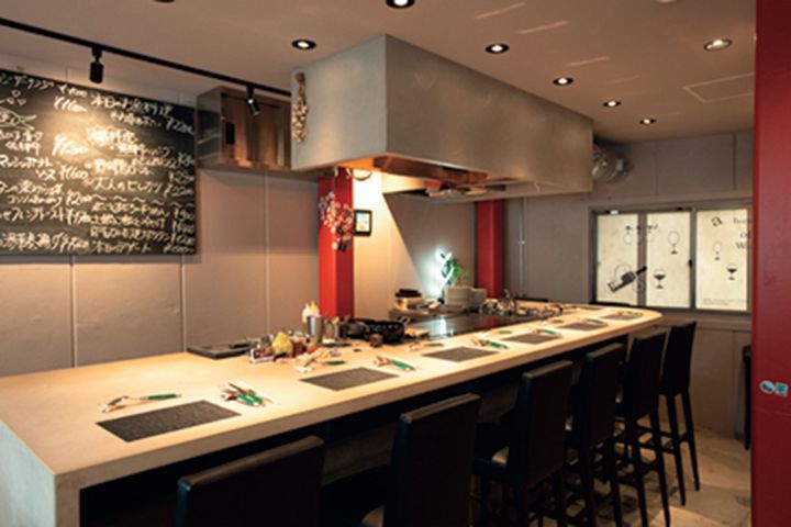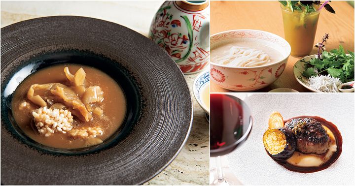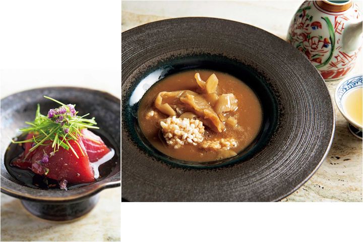 日仏のレストランで研鑽を積んだ小澤圭司さんと、老舗割烹や名旅館などで腕を磨いた小野健二さん。岐阜県で同級生だった二人が構えたこちらでは、郷里の食材を取り入れつつ、フレンチと和食、さらにそれぞれを融合させた創作料理が繰り出されます。カウンターの鉄板で焼き上げるメニューも取り揃え、目も舌も楽しませてくれます。