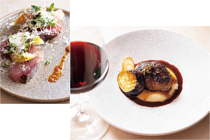 〈右〉極粗挽きにした飛騨牛に美濃ポークをブレンドした、肉肉しい味わいがジューシーに広がるハンバーグには、爽やかな香りが弾ける飛騨山椒を効かせて。飛騨牛ハンバーグ 飛騨山椒のソース¥2,400、グラスワイン¥1,100~〈左〉さっぱりとした脂のりのイナダにりんごを添え、かんずりをアクセントにしたソースで。本日の鮮魚のカルパッチョ¥1,600