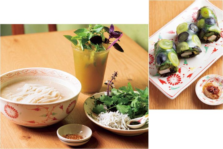 〈左〉落花生「おおまさり」を焙煎し、香ばしさを引き出したクリーミーなスープ。山利のしらすとハーブを具材に、自家製七味と海老出汁のキャラメルで味変を。フレッシュバジルたっぷりのカクテルと。おおまさりのフォー¥2,400、バジルスマッシュ!¥1,400〈右〉瑞々しい葡萄と海老、羅臼昆布の佃煮を包み、一年物の蜂蜜漬け金木犀を加えたアーモンドのソースで。巨峰とシャインマスカット、海老の生春巻き1ピース¥800