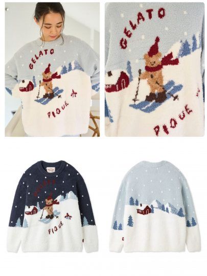 ホリデー感漂うベアモチーフのルームウェア。雪山をスキーして、大切な人にプレゼントを運ぶベアをパネルで大胆に表現したプルオーバー。