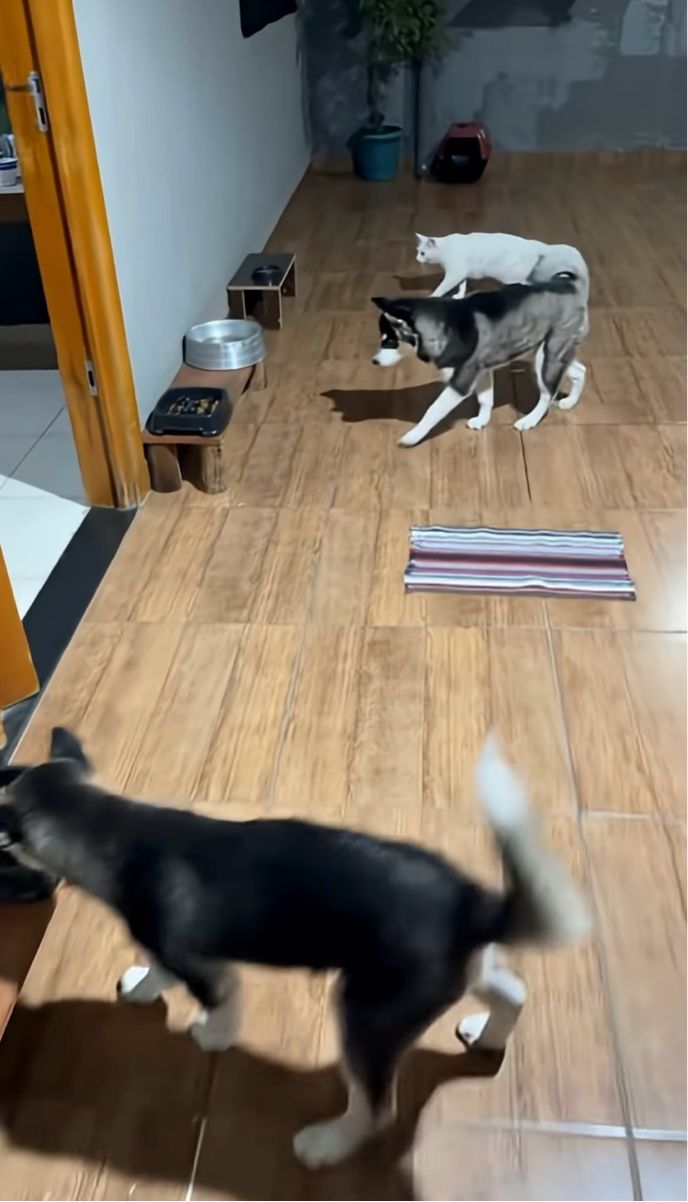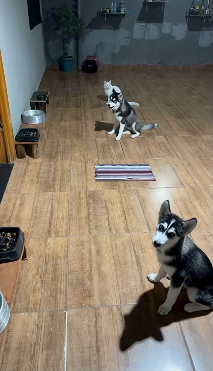 ご飯が入ったボウルの前に、3匹のペットたちがお行儀よくお座りしています。 手前の2匹はハスキー犬の子犬、そして一番奥にはネコの姿も!