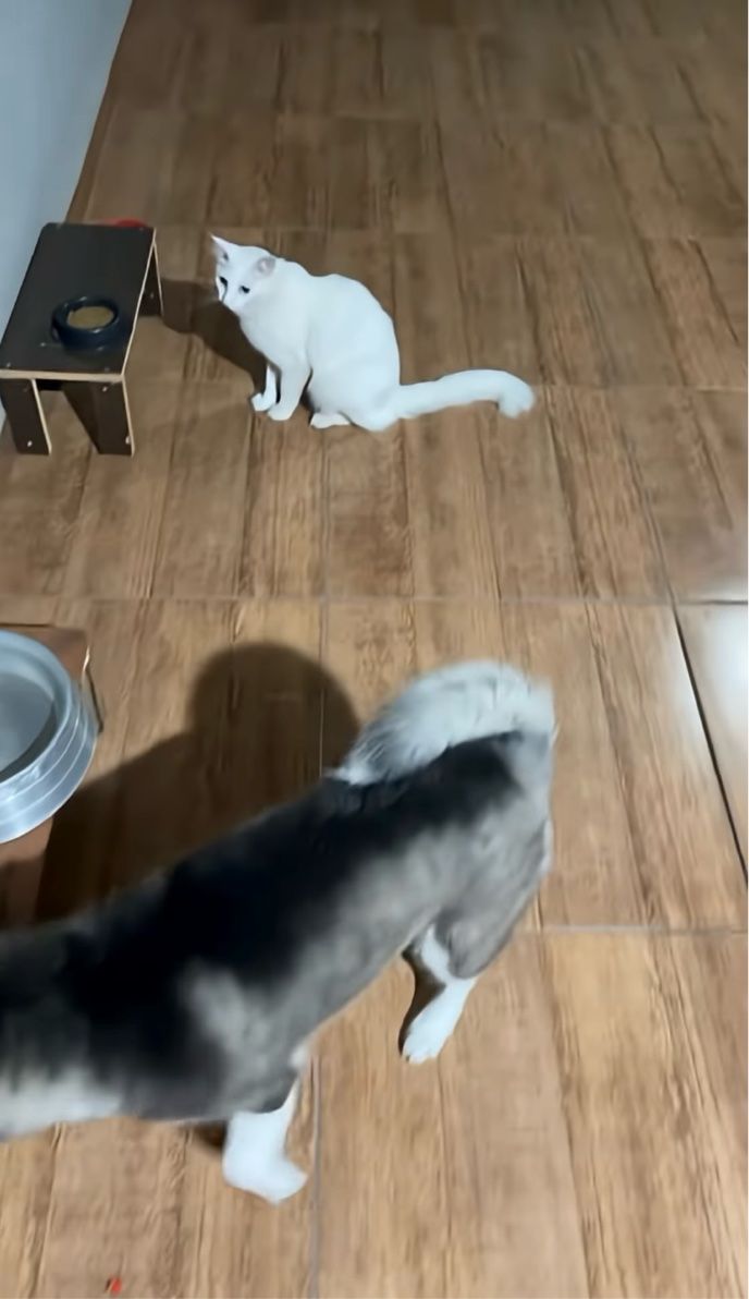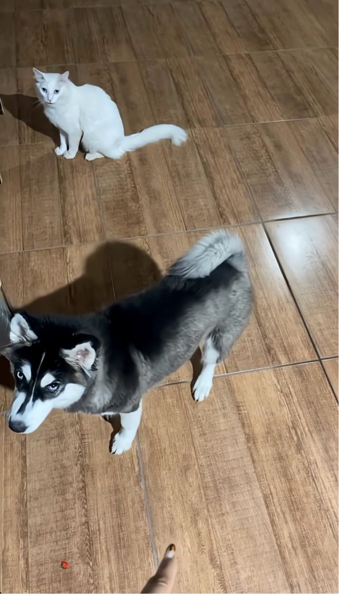 ご飯を目の前にして「待て」のトレーニングを受けるハスキー犬の子犬たちとネコ。 可愛らしいメンバーたちによる訓練の様子は、こちらの動画からご覧いただけます。